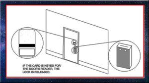 کاربر باید یک کارت معتبر را به کارتخوان روی در وارد کرده تا قفل بازشود و اجازه ورود پیدا کند. مکانیسم کنترل دستگیره و باز شدن هر قفلی مستقل و جدا از پنل کنترل دسترسی یا سامانه کنترل مرکزی است. این سامانهها در دو نوع فناوری در دسترس هستند: کارتهای دارای نوار کد دار شده مغناطیسی و کارتهای هوشمند (شکل 11). کارتهای دارای نوار کددار و کارتهای هوشمند در موقع وارد شدن کارت نیاز به کلید برای رمزگشایی شدن دارند. نوار روی کارت معمولاً شامل 140 بیت اطلاعات از یک تا سه ردیف است که شامل نام کاربری، سطح دسترسی مجاز، تاریخ انقضاء و سایر اطلاعات است.